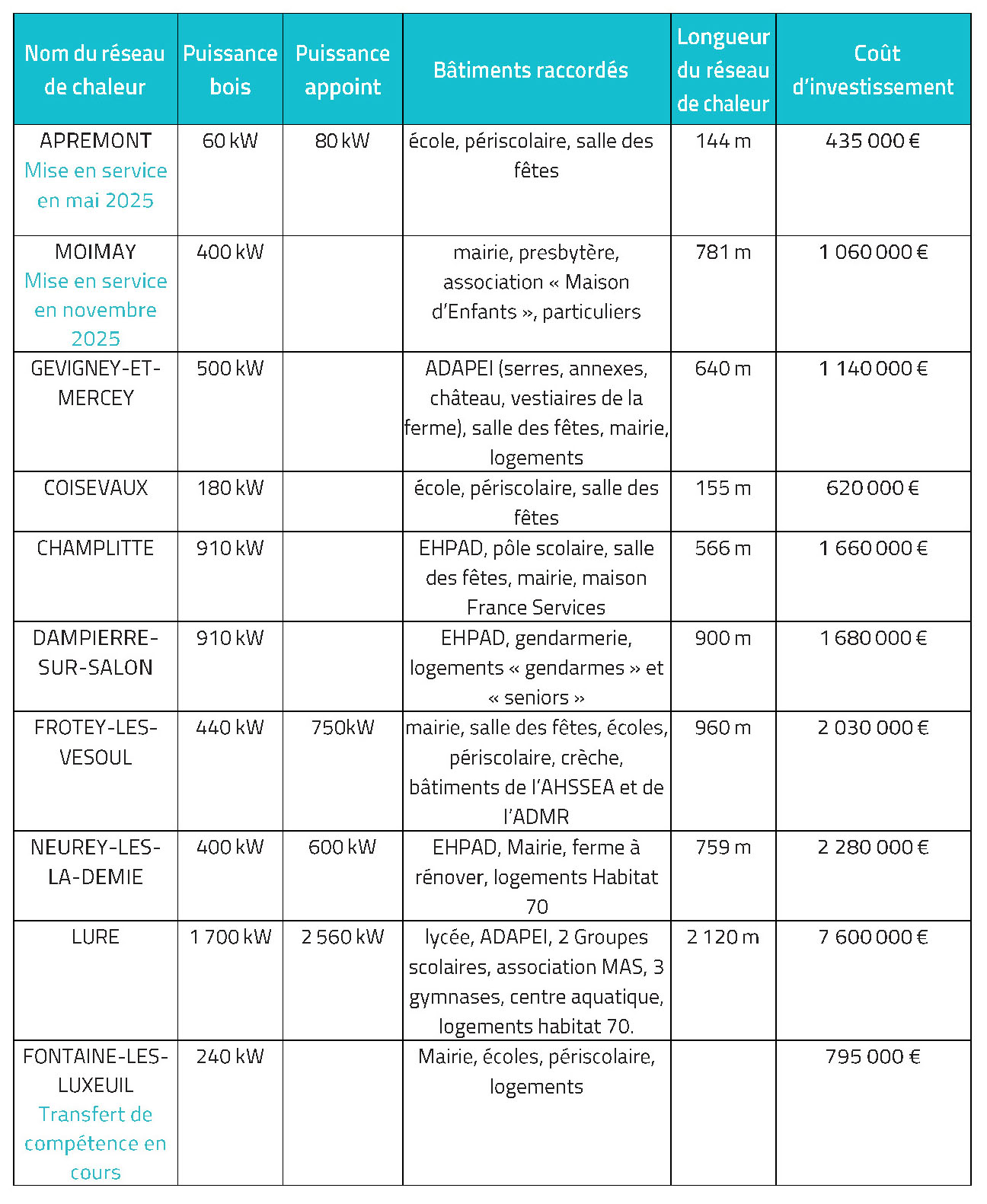 Il en a également quatre en phase de construction à Dampierre-sur-Salon, Gevigney-et-Mercey, Coisevaux et Neurey-les-la-Demie et trois autres en phase de maîtrise d'œuvre à Champlitte, Frotey-les-Vesoul et Lure. La commune de Fontaine-lès-Luxeuil a transféré sa compétence « chaufferie bois avec réseau de chaleur » au SIED 70.